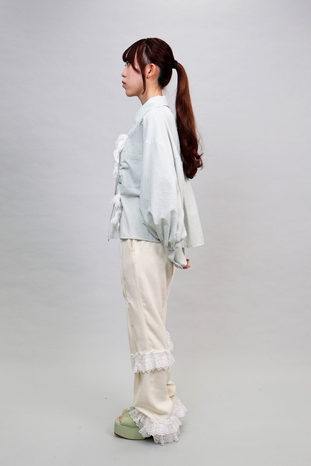 07003 チェックリボン3シーズンシャツ:ドロストのリボンをレースにしてシンプルになりすぎないデザインに。